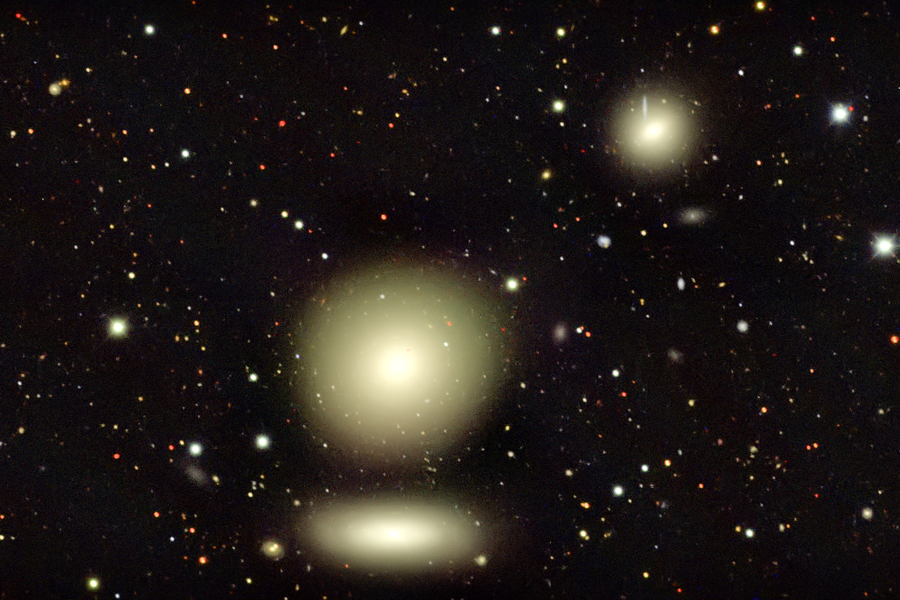 Some celestial (light-producing) objects are farther away than others. The three larger galaxies in today’s image are nearby, located in the Fornax galaxy cluster. As you can see, light comes from other galaxies much farther away: the smaller points are galaxies, too. We measure the patterns in the galaxies that are far away from us and compare that to the patterns of the nearby galaxies. Differences in this pattern give us indispensable clues about how dark energy has affected space-time over the last several billions of years.
