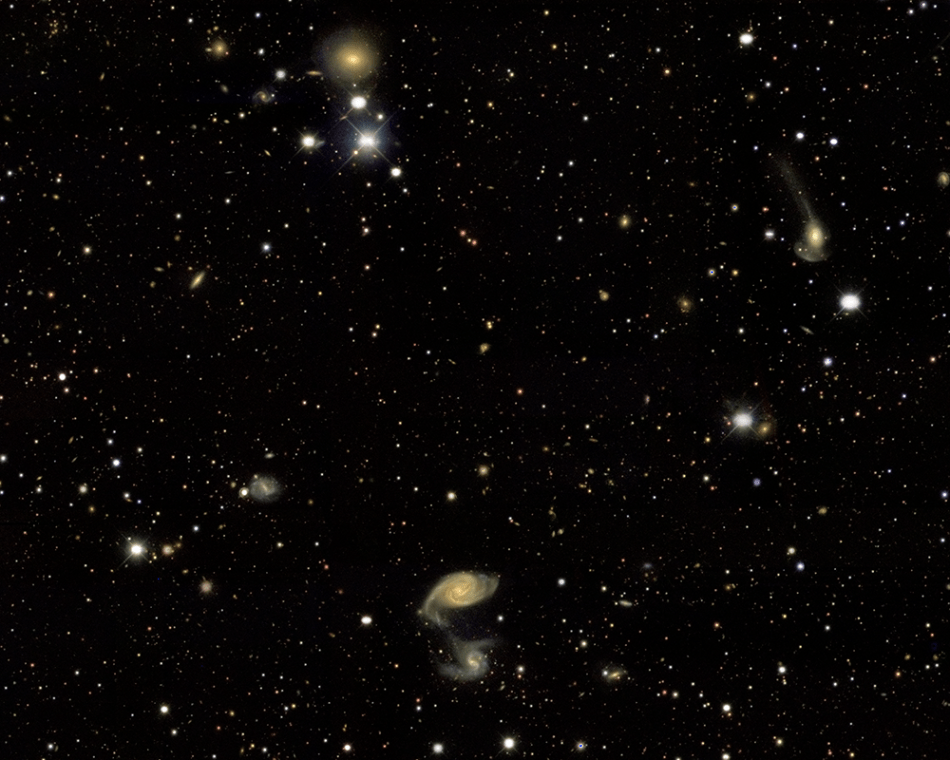 After changing our notion of what a galaxy is and our place in the universe, Hubble set out to categorize the different kinds of galaxies. Pictured above are many types of galaxies captured by the Dark Energy Camera (DECam). There are at least five or six easy-to-spot galaxies – the edge-on spiral on the right side, the pair of colliding spirals at the bottom center, a big spiral in the top-left, and an elliptical on the far left.