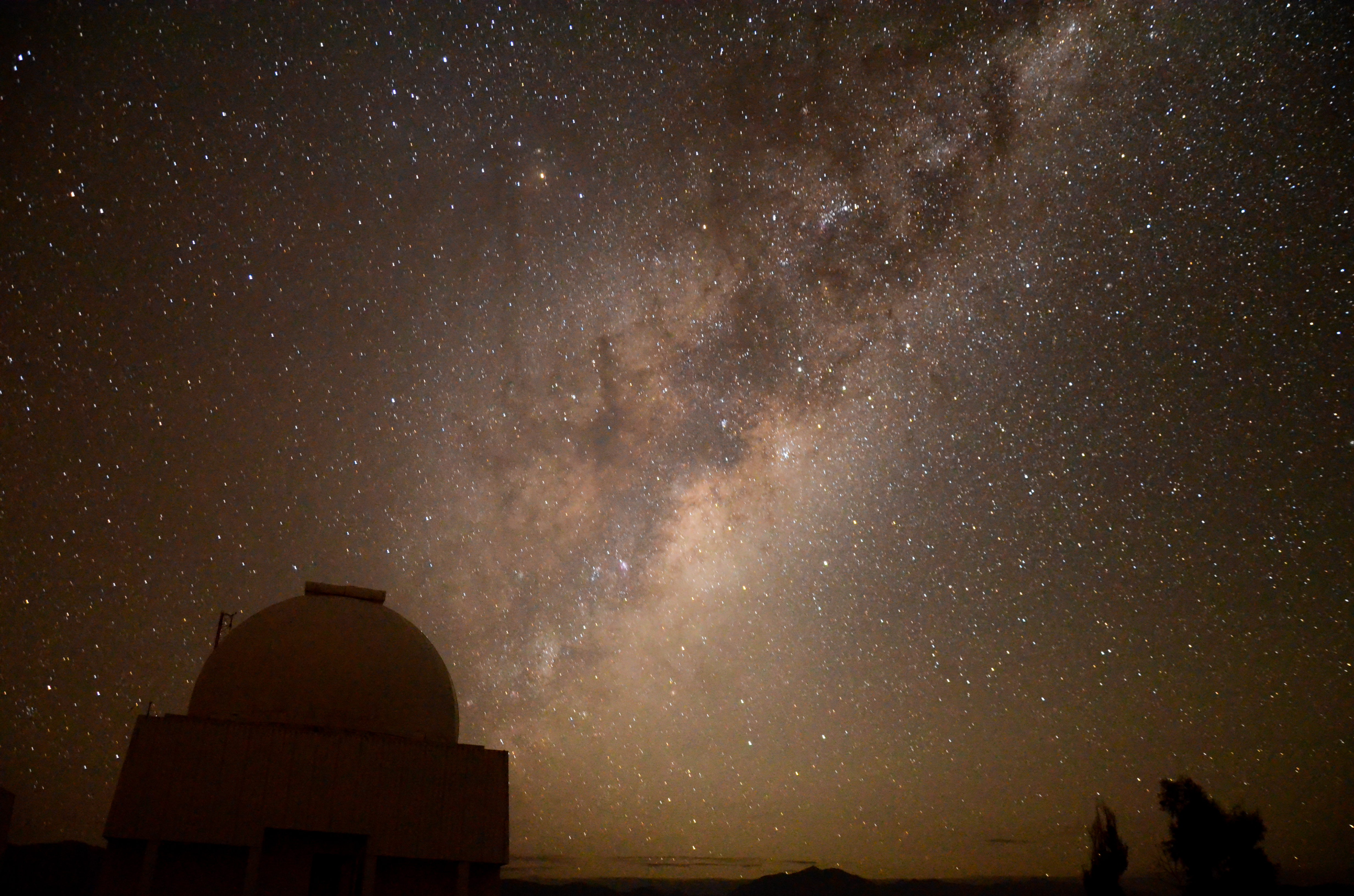What’s it like to look into the eye of our galaxy? Facing away from the Blanco Dome, to the north, we can see a clumpy, disc-like cloud spread across the sky. Our solar system resides in the disc of the spiral Milky Way, and when we look out to the cosmos in this direction of the sky, we’re staring into the plane of our home galaxy.