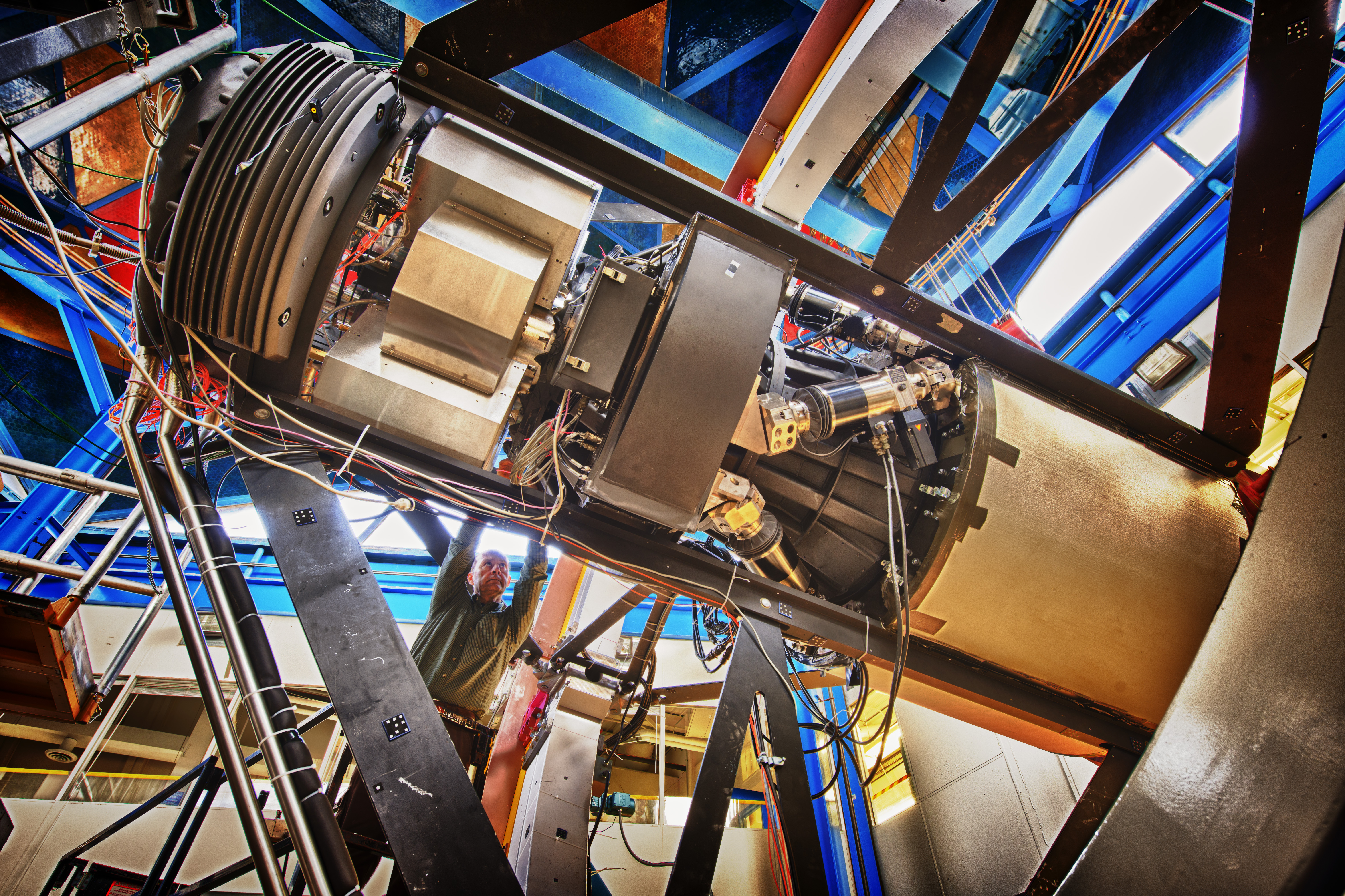 In the image, DECam is not yet actually on the Blanco Telescope, which is in Chile. Before being installed there, it was assembled at the Fermi National Accelerator Laboratory (FNAL) in Batavia, Illinois in a test facility. The operations team performed tests to make sure that the multiple components came together and operated seamlessly before shipping all the components to their final location at the Cerro Tololo Inter-American Observatory (CTIO). Fermilab technician Kevin Kuk works on the last elements of assembly before testing.