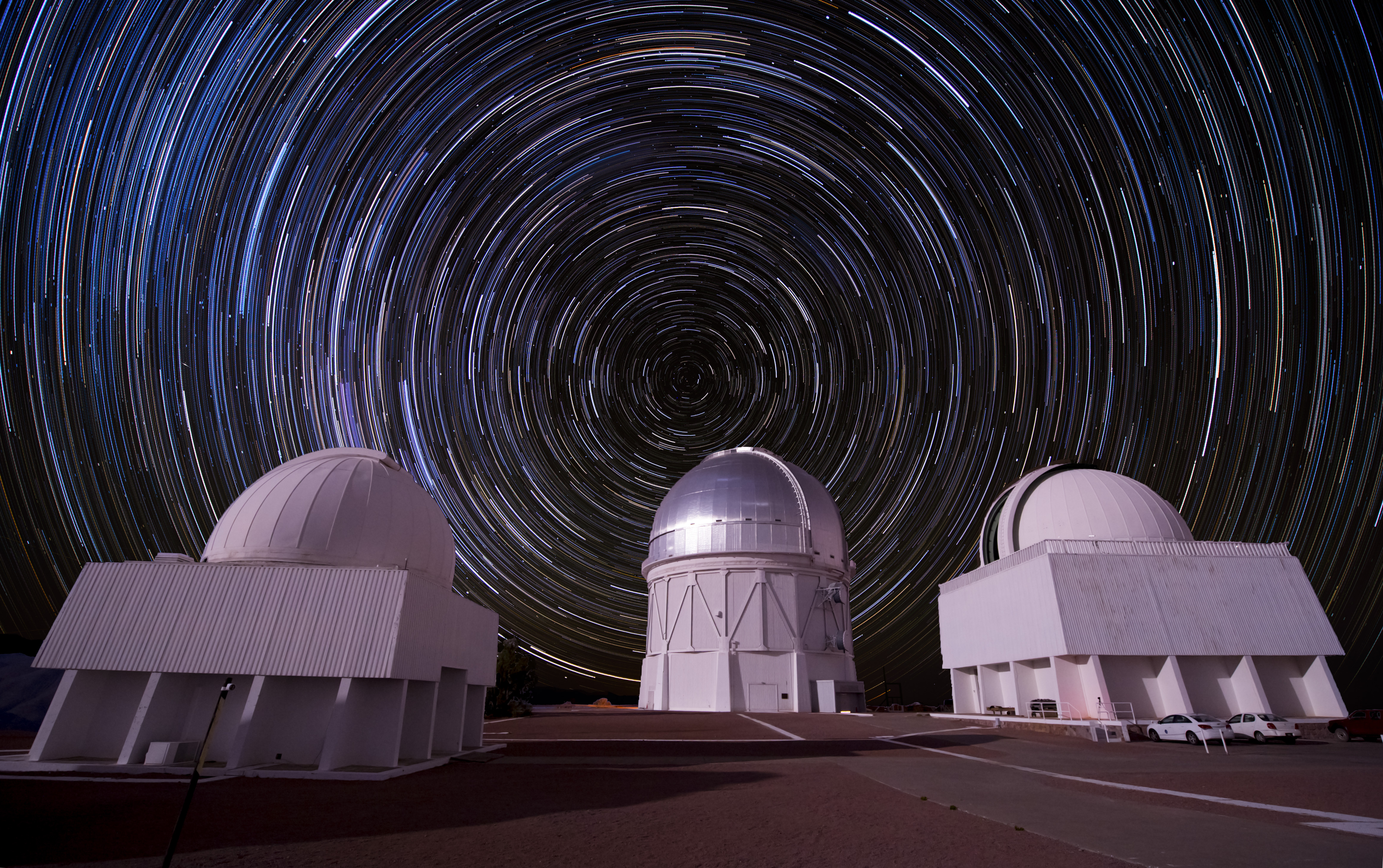 Moonlight illuminates the top-most plateau of the Cerro Tololo Inter-American Observatory (CTIO), near La Serena, Chile—and with it, the Blanco 4-meter telescope dome (middle) that houses the Dark Energy Camera (DECam). Directly above the dome, we see Earth’s south pole, about which the world turns and our celestial sphere rotates, giving us this vortex of starlight. Peering out of our little blue dot, our little snow globe, we also look into the depths of space and into our universe’s past.